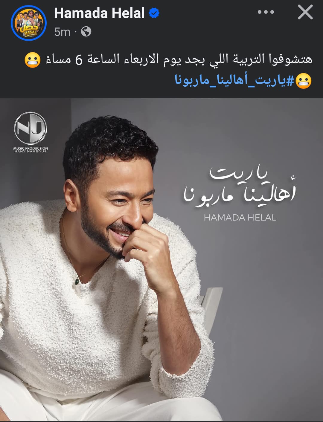 يستعد الفنان حمادة هلال لطرح أحدث أغانيه والتي تحمل اسم ياريت أهالينا ما ربونا في الأربعاء المقبل الموافق 18 ديسمبر الجاري عبر موقع الفيديوهات يوتيوب وجميع وسائل التواصل الاجتماعي .