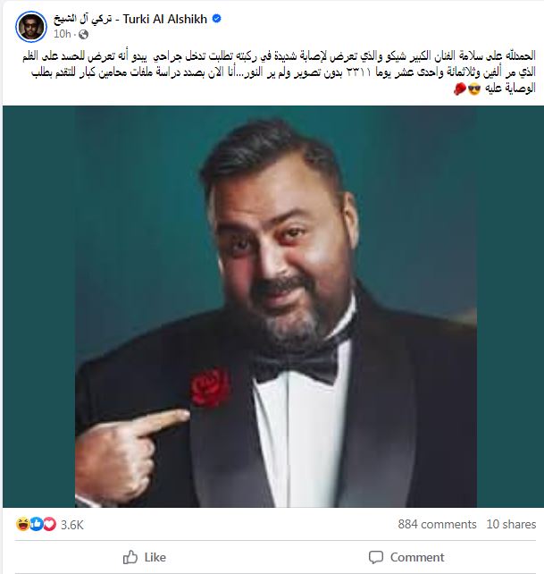 وكتب تركي آل الشيخ عبر صفحته الرسمية "فيس بوك" الحمدلله على سلامة الفنان الكبير شيكو والذي تعرض لإصابة شديدة في ركبته تطلبت تدخل جراحي يبدو أنه تعرض للحسد على الفيلم الذي مر ألفين وثلاثمائة وإحدى عشر يوما ٢٣١١ بدون تصوير ولم ير النور".