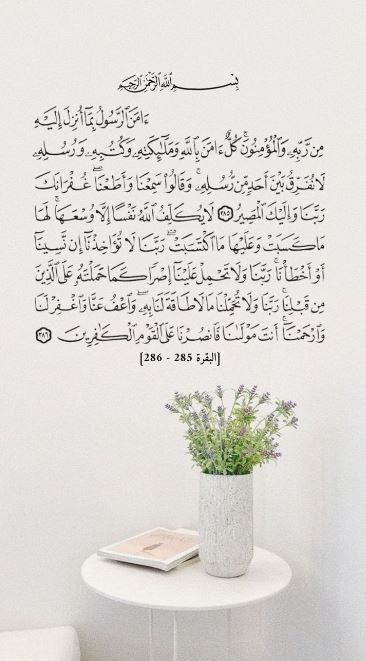 « آمَنَ الرّسُولُ بِمَآ أُنْزِلَ إِلَيْهِ مِن رّبّهِ وَالْمُؤْمِنُونَ كُلّ آمَنَ بِاللّهِ وَمَلآئِكَتِهِ وَكُتُبِهِ وَرُسُلِهِ لاَ نُفَرّقُ بَيْنَ أَحَدٍ مّن رّسُلِهِ وَقَالُواْ سَمِعْنَا وَأَطَعْنَا غُفْرَانَكَ رَبّنَا وَإِلَيْكَ الْمَصِير لاَ يُكَلّفُ اللّهُ نَفْسًا إِلاّ وُسْعَهَا لَهَا مَا كَسَبَتْ وَعَلَيْهَا مَا اكْتَسَبَتْ رَبّنَا لاَ تُؤَاخِذْنَا إِن نّسِينَآ أَوْ أَخْطَأْنَا رَبّنَا وَلاَ تَحْمِلْ عَلَيْنَآ إِصْرًا كَمَا حَمَلْتَهُ عَلَى الّذِينَ مِن قَبْلِنَا رَبّنَا وَلاَ تُحَمّلْنَا مَا لاَ طَاقـَةَ لَنَا بِهِ وَاعْفُ عَنّا وَاغْفِرْ لَنَا وَارْحَمْنَآ أَنتَ مَوْلاَنَا فَانْصُرْنَا عَلَى الْقَوْمِ الْكَافِرِينَ » الآيات 285- 286 من سورة البقرة.