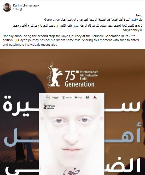 وكتب كريم الشناوي عبر حسابه بموقع "فيس بوك": "رسميا..فيلم ضي «سيرة أهل الضي» في المسابقة الرسمية لمهرجان برلين قسم أجيال Generation، لا توجد كلمات كافية لوصف مدى امتناني لكل شركاء الرحلة أمام وخلف الكاميرا وداعمي التجربة وهم كثر وأولهم زوجتي".
