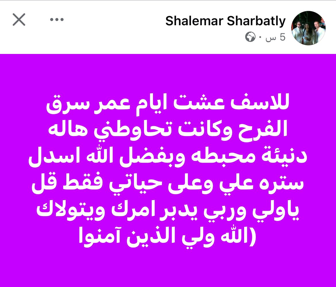 وكتبت شربتلي عبر "فيسبوك" منشور تفاعل معه العديد من متابعيها وأصدقائها وقالت فيه: "للأسف عشت أيام حزينة.. عمر سرق الفرح وكانت تحاوطني هالة دنيئة محبطة وبفضل الله أسدل ستره علي وعلى حياتي فقط قل يا ولي وربي يدبر أمرك ويتولاك -الله ولي الذين آمنوا-".