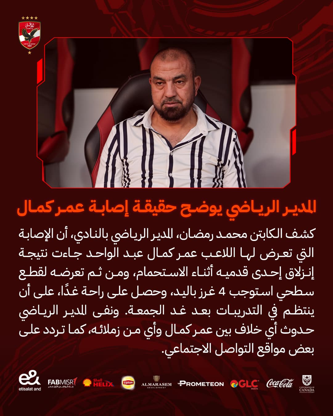 كشف الكابتن محمد رمضان المدير الرياضي بالنادي الأهلي أن الإصابة التي تعرض لها اللاعب عمر كمال عبدالواحد جاءت نتيجة إنزلاق إحدى قدميه أثناء الاستحمام، ومن ثم تعرض لقطع سطحي استوجب 4 غرز باليد، وحصل على راحة غدا على أن ينتظم في التدريبات بعد غد الجمعة .