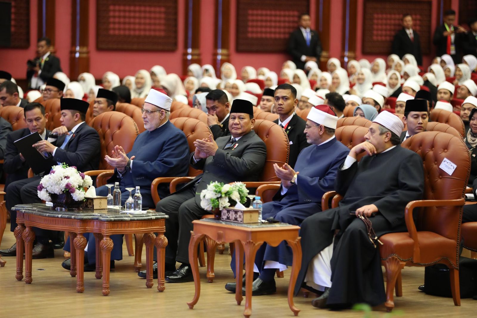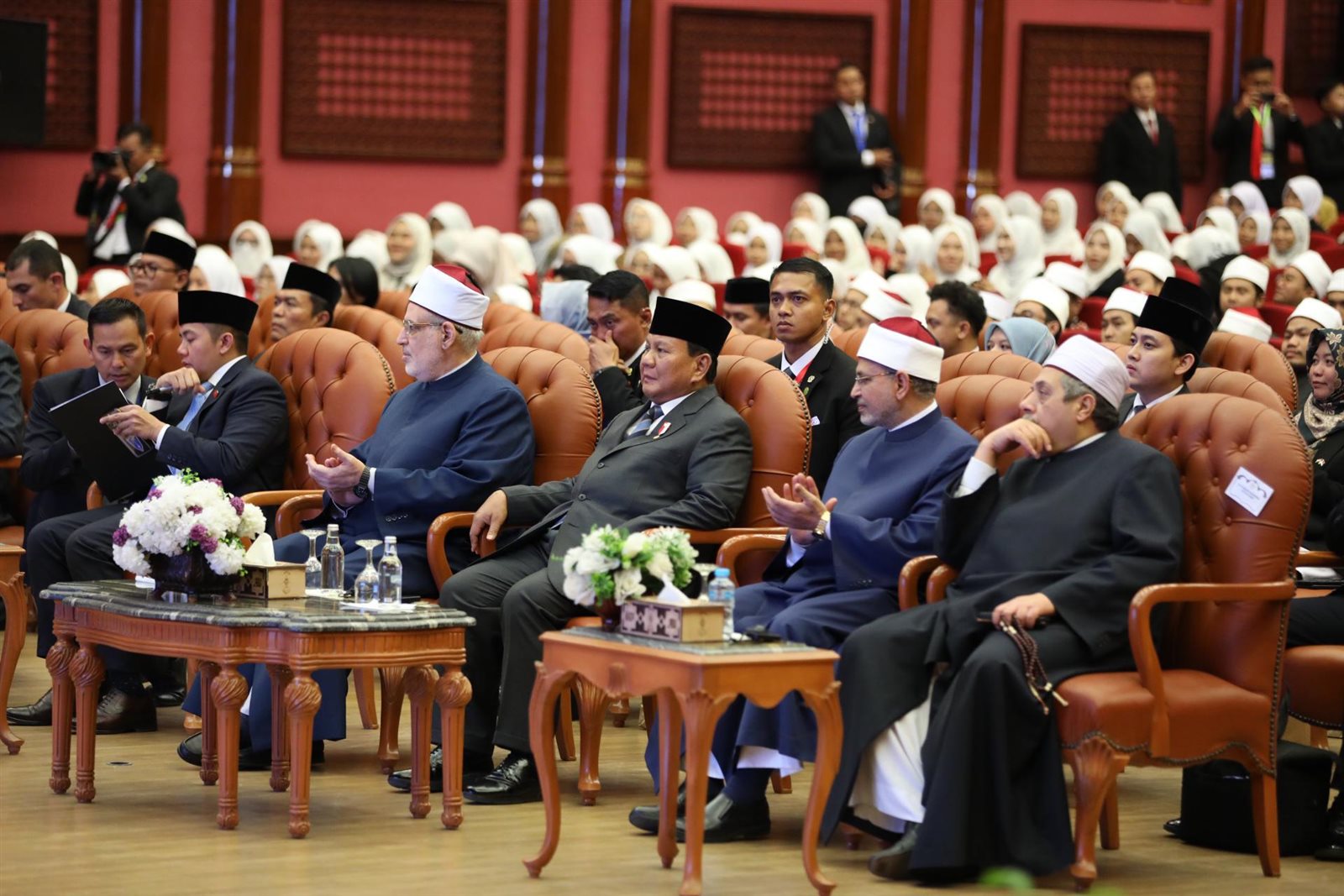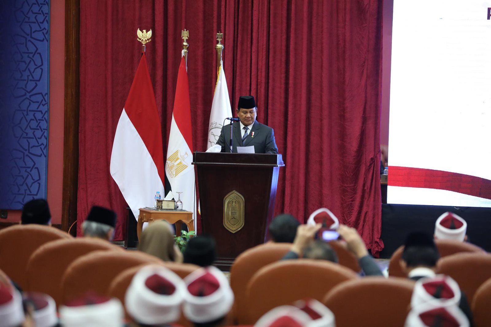 قال فرابوو سوبيانتو، الرئيس الإندونيسي، إنني أفتخر بأبنائي الدارسين بالأزهر، ولقد أسعدني لقائي مع أبنائي الدارسين في رحاب الأزهر الشريف اليوم، مضيفا أنه قد تخرج في الأزهر الكثير من أبناء إندونيسيا منهم رؤساء جمهورية ورؤساء وزراء وهذا فخر لنا جميعا كعبد الرحمن وحيد، الرئيس الرابع لإندونيسيا.