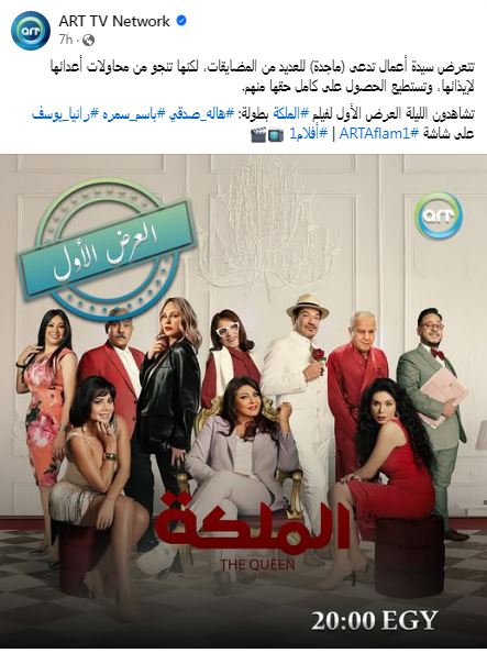 أعلنت الصفحة الرسمية لـ قناة art عبر صفحتها على موقع التواصل الاجتماعي "فيس بوك" عن موعد العرض الأول لـ فيلم الملكة بطولة الفنانة هالة صدقي والمقرر عرضه الليلة .