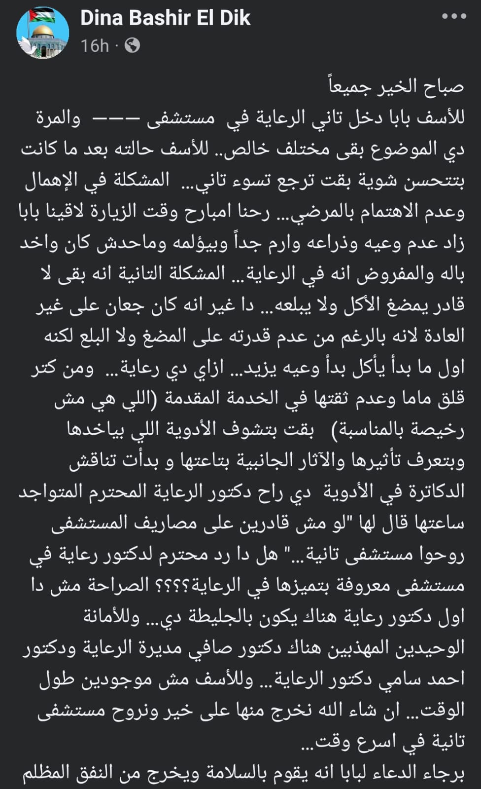 كتبت ابنة بشير الديك على صفحتها عبر موقع التواصل الاجتماعي "فيسبوك" وعلقت قائلة : "للأسف بابا دخل تاني الرعاية في مستشفى ——— والمرة دي الموضوع بقى مختلف خالص.. للأسف حالته بعد ما كانت بتتحسن شوية بقت ترجع تسوء تاني… المشكلة في الإهمال وعدم الاهتمام بالمرضي… رحنا امبارح وقت الزيارة لاقينا بابا زاد عدم وعيه وذراعه وارم جداً وبيؤلمه وماحدش كان واخد باله والمفروض انه في الرعاية… المشكلة التانية انه بقى لا قادر يمضغ الأكل ولا يبلعه… دا غير انه كان جعان على غير العادة لانه بالرغم من عدم قدرته على المضغ ولا البلع لكنه اول ما بدأ يأكل بدأ وعيه يزيد… ازاي دي رعاية… ومن كتر قلق ماما وعدم ثقتها في الخدمة المقدمة (اللي هي مش رخيصة بالمناسبة) بقت بتشوف الأدوية اللي بياخدها وبتعرف تأثيرها والآثار الجانبية بتاعتها و بدأت تناقش الدكاترة في الأدوية دي راح دكتور الرعاية المحترم المتواجد ساعتها قال لها "لو مش قادرين على مصاريف المستشفى روحوا مستشفى تانية…" هل دا رد محترم لدكتور رعاية في مستشفى معروفة بتميزها في الرعاية؟؟؟؟ الصراحة مش دا اول دكتور رعاية هناك يكون بالجليطة دي… وللأمانة الوحيدين المهذبين هناك دكتور صافي مديرة الرعاية ودكتور احمد سامي دكتور الرعاية… وللأسف مش موجودين طول الوقت… ان شاء الله نخرج منها على خير ونروح مستشفى تانية في اسرع وقت" .
