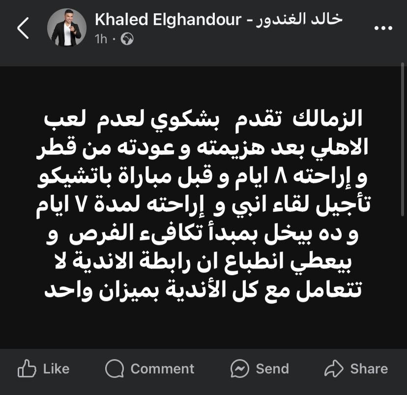 وكتب خالد الغندور عبر صفحته الرسمية على موقع التواصل الاجتماعي “فيس بوك” منشورًا جاء فيه: “الزمالك سيتقدم بشكوى لعدم لعب الأهلي بعد هزيمته وعودته من قطر وإراحته 8 أيام، وقبل مباراة باتشيكو تأجيل لقاء إنبي وإراحته لمدة 7 أيام”.