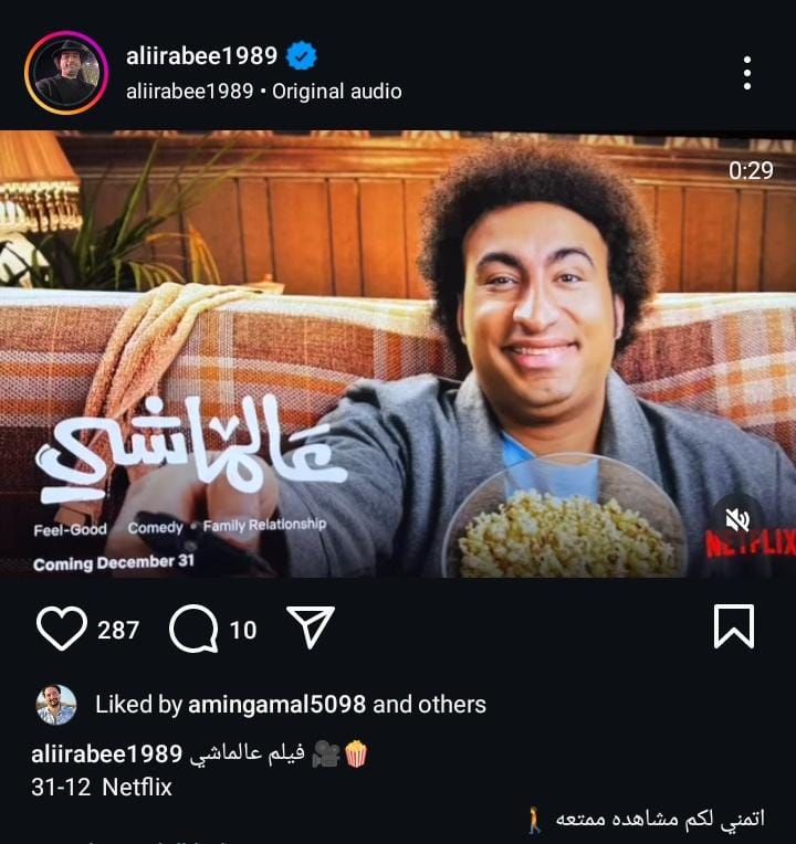 من المقرر عرض فيلم عالماشي بطولة علي ربيع في يوم الثلاثاء الموافق 31 ديسمبر علي المنصة الإلكترونية Netflix إحتفالا بليلة رأس السنة الجديدة 2025.