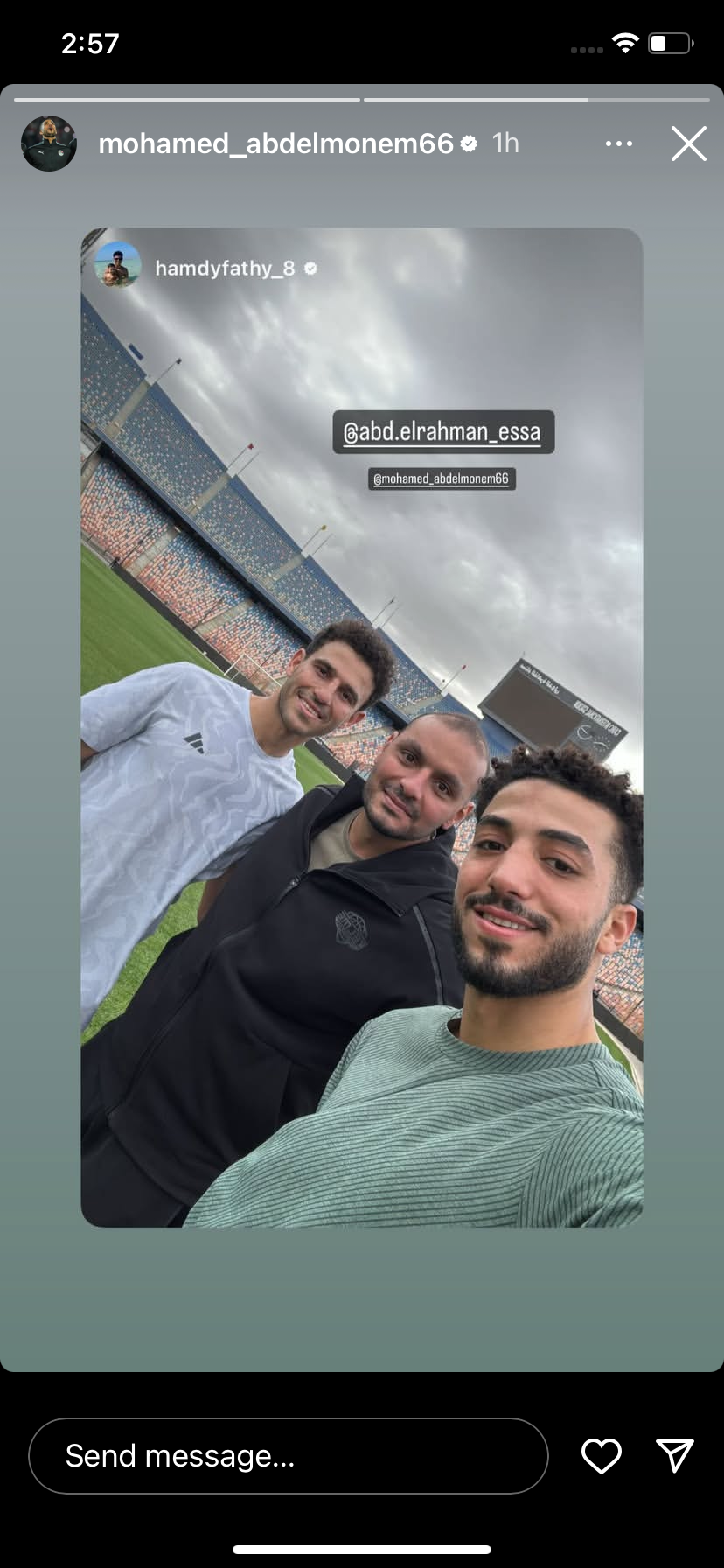ظهر حمدي فتحي لاعب وسط الوكرة القطري الحالي والأهلي السابق، برفقة زميله في الأهلي سابقاً محمد عبد المنعم لاعب نيس الفرنسي خلال تواجدهما في استاد القاهرة لخوض التدريبات التأهيلية لهم.