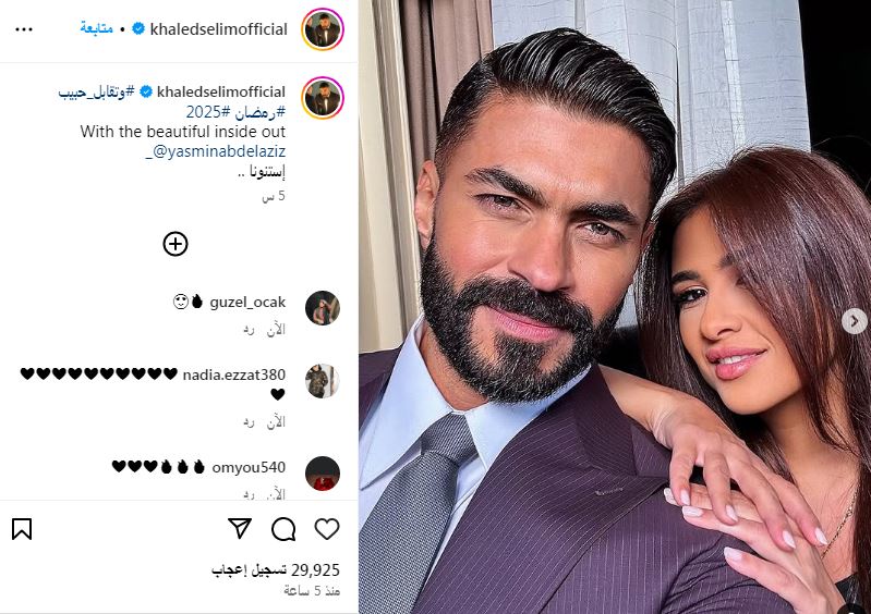 ونشر سليم الصور عبر صفحته الرسمية "إنستجرام" وعلق عليها "وتقابل حبيب رمضان 2025، مع الجميلة من الداخل والخارج ياسمين عبد العزيز،استنونا ..".