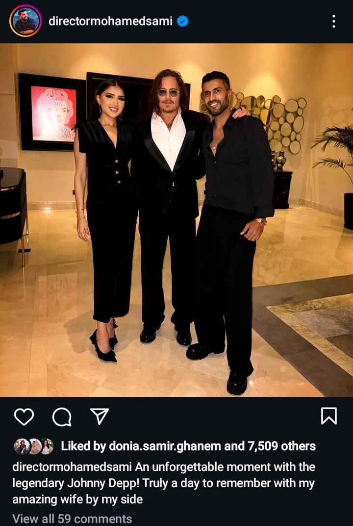 وعلق سامي علي الصورة التي نشرها عبر صفحته الرسمية "إنستجرام" " لحظة لا تنسى مع الأسطورة جوني ديب وزوجتي العزيزة ".