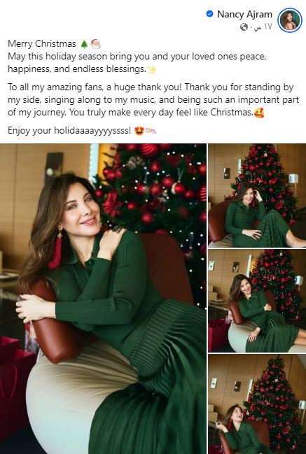 ونشر نانسي الصور عبر صفحتها الرسمية "فيس بوك" ووجهت رسالة لجمهورها ومحبيها قائلة " عيد ميلاد سعيد أتمنى أن يجلب موسم الأعياد هذا لك ولأحبابك السلام والسعادة والبركات التي لا تنتهي".
