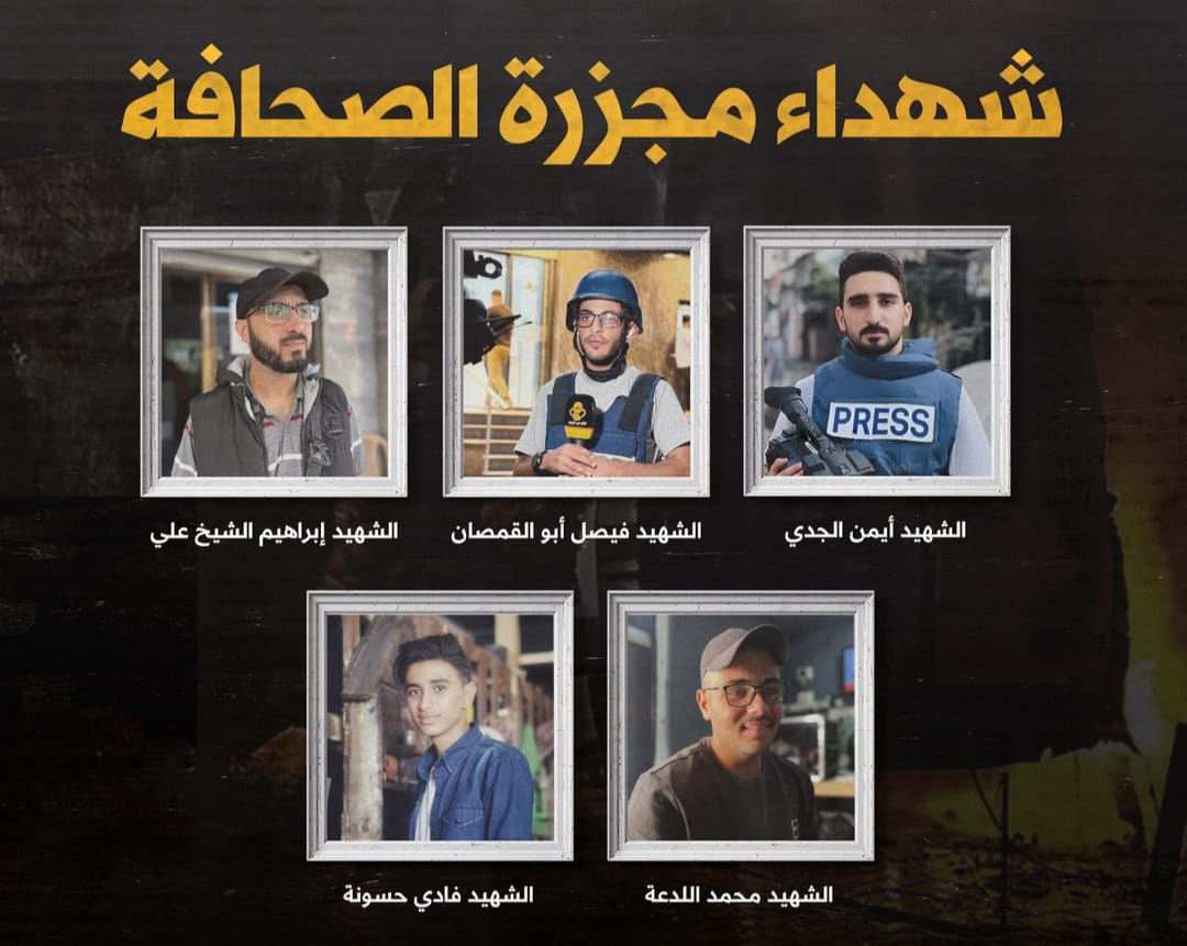 استشهد 5 صحفيين فلسطينيين بعدما قصفت طائرات الاحتلال سيارة بث تابعة لقناة القدس اليوم أمام مستشفى العودة بمخيم النصيرات وسط قطاع غزة.