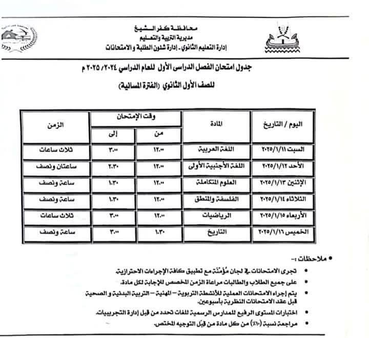 جدول امتحانات الصفين الأول والثاني الثانوي الترم الأول 2025