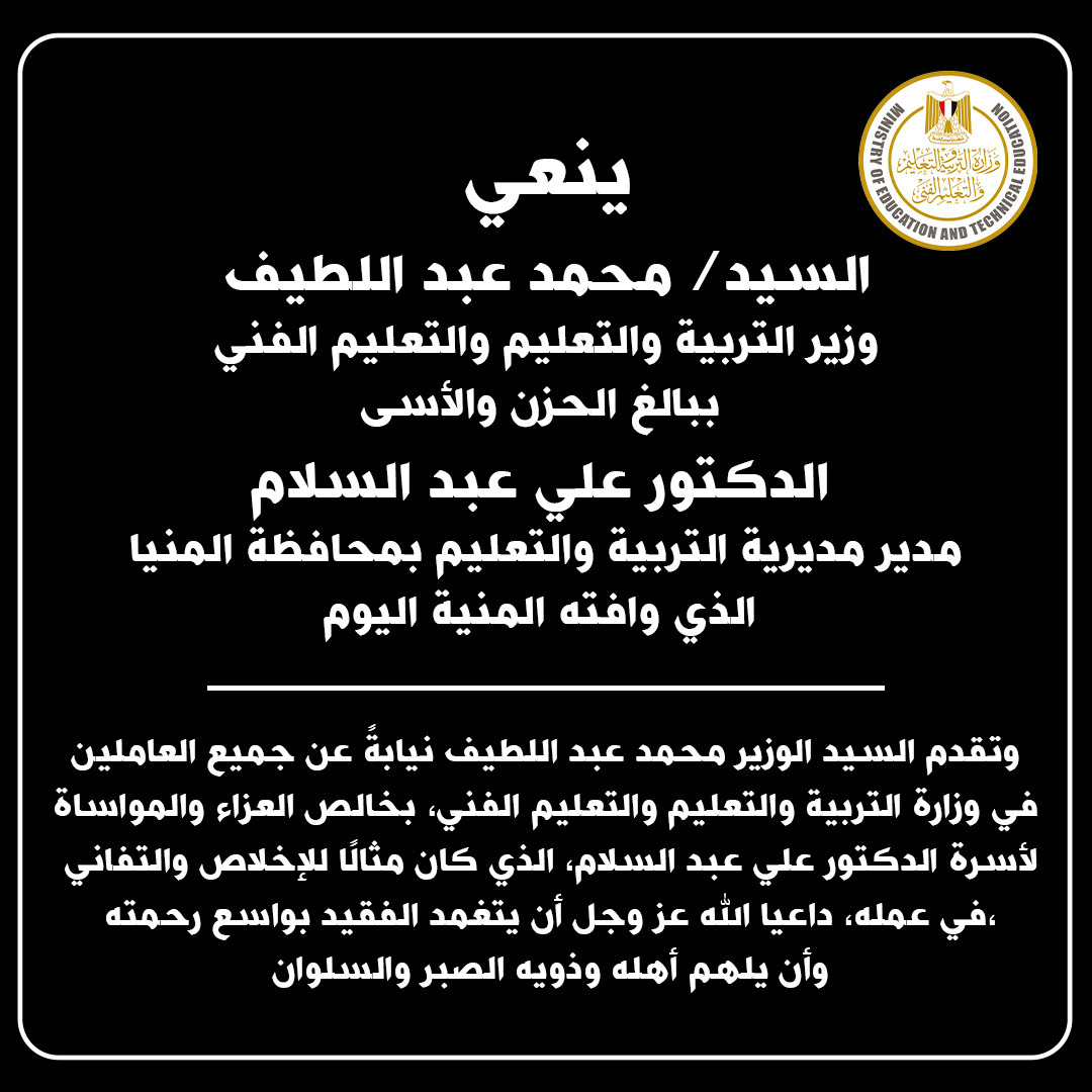 وتقدم وزير التربية والتعليم والتعليم الفني محمد عبد اللطيف نيابةً عن جميع العاملين في وزارة التربية والتعليم والتعليم الفني، بخالص العزاء والمواساة لأسرة الدكتور علي عبد السلام، الذي كان مثالًا للإخلاص والتفاني في عمله، داعيا الله عز وجل أن يتغمد الفقيد بواسع رحمته، وأن يلهم أهله وذويه الصبر والسلوان.