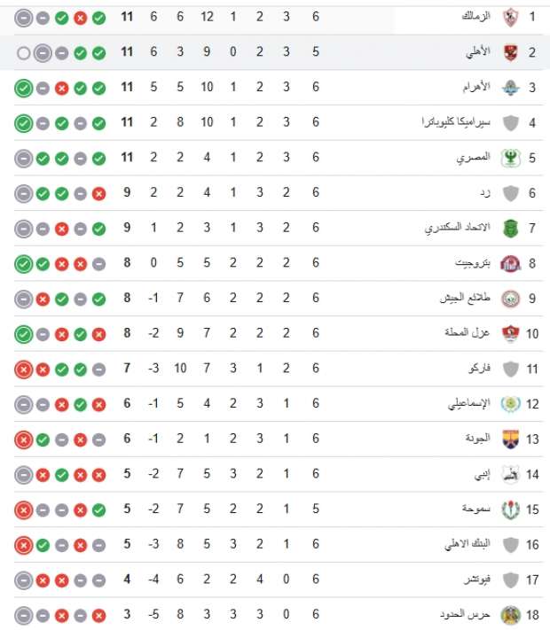 ويملك النادي الأهلي 8 نقاط بعدما لعب 4 مباريات حقق الفوز فى مباراتين وتعادل فى مثلهم وسجل سبعة أهداف وتلقت شباكه ثلاثة أهداف ومازال لديه لقاء مؤجل أمام سموحة فيما يملك المصرى البورسعيدى 11 نقطة بعدما لعب 5 مباريات حقق الفوز فى 3 لقاءات وتعادل مرتين وسجل لاعبيه 4 أهداف ولم تتلقى شباكه أى أهداف.