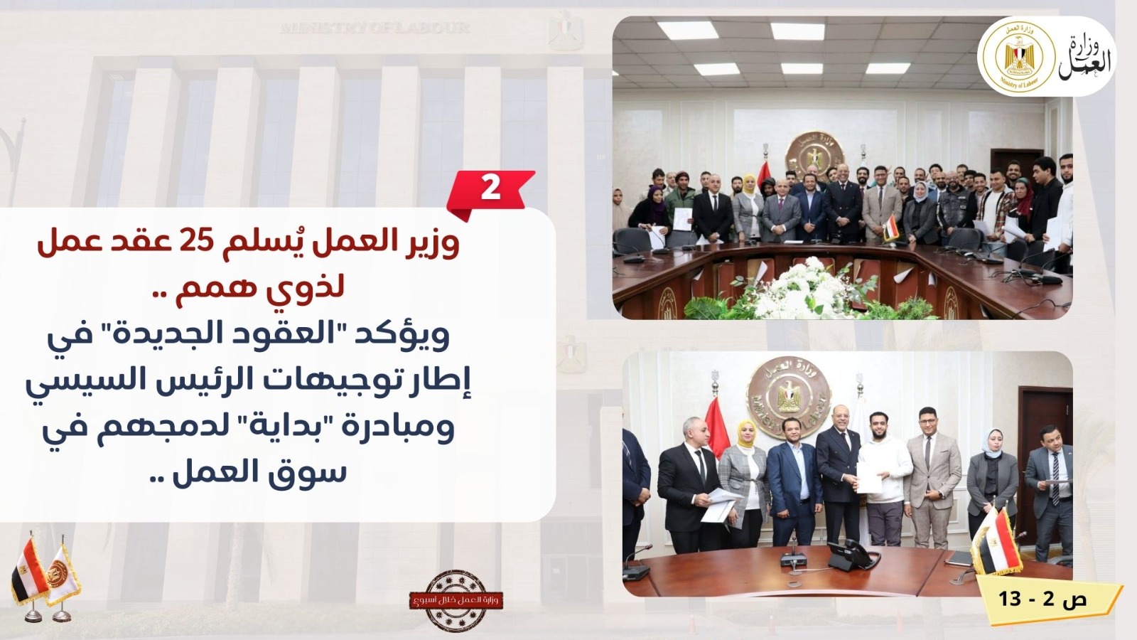 وسَلّم وزير العمل ،بديوان عام "الوزارة" ، 25 عقد عمل لذوي همم "15 عقد بشركة سيتي ستارز للإدارة والاستشارات العقارية"، و"10 عقود في شركة ليوني الألمانية لكابلات وضفائر السيارات"، وذلك بحضور ممثلين عن إدارة "الشركتين".