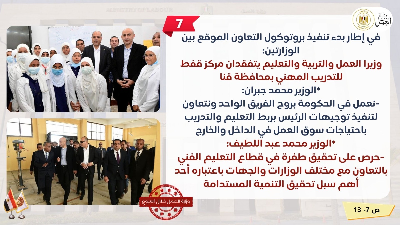 حيث أنه في إطار بدء تنفيذ بروتوكول التعاون المُوقع بين وزارتي التربية والتعليم والتعليم الفني والعمل بشأن ربط مخرجات التعليم والتدريب المهني باحتياجات سوق العمل، والمُشاركة في تشغيل وإدارة مراكز التدريب الثابتة، أجرى السيد/ محمد جبران وزير العمل، ومحمد عبد اللطيف وزير التربية والتعليم والتعليم الفني زيارة لمحافظة قنا، حيث تفقدا مركز قفط للتدريب المهني الذي يقع في مركز مدينة قفط،بحضور الدكتور حازم عمر نائب محافظ قنا.. شهدت الزيارة تسليم عقود لذوي همم ،وشهادات إتمام دورات تدريبية ...وكذلك تفقد مجموعة من المدارس..