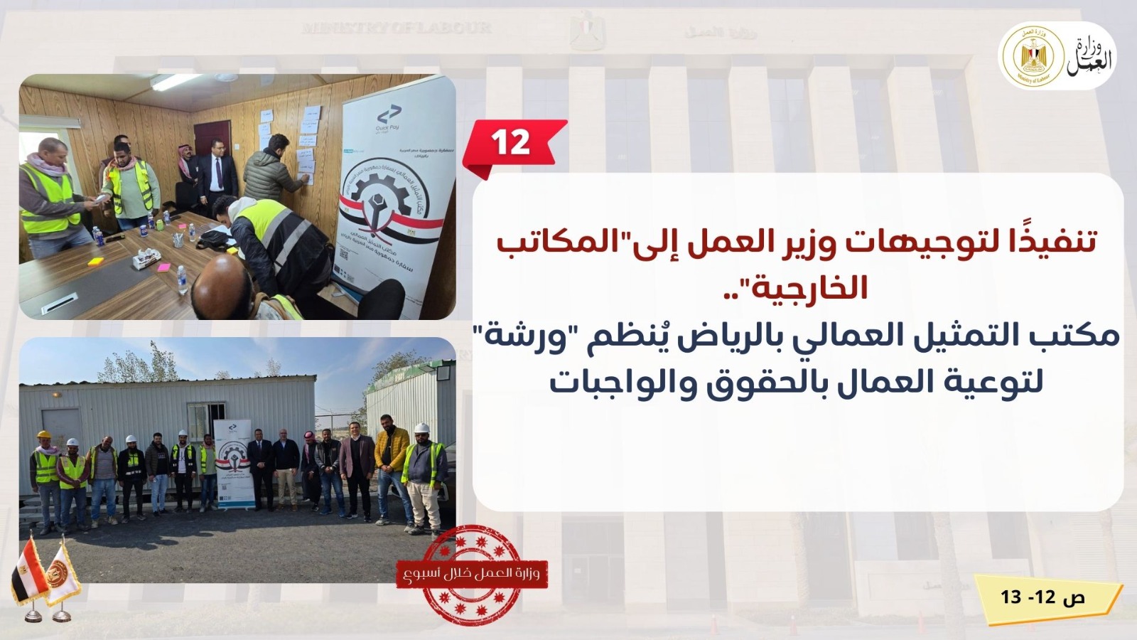 ولتنفيذ توجيهات الوزير نظم مكتب التمثيل العمالي المصري في الرياض ،بالمملكة العربية السعودية، ورشة عمل ،إستفادت منها العمالة المصرية بشركة مياه الخليجية في منطقة الإحساء، بالمنطقة الشرقية،والتي تبعد 400 كيلو متر عن الرياض ،وذلك لتوعيتهم بحقوقهم وواجباتهم داخل مواقع العمل ،خاصة التشريعات السعودية ذات الصلة ،وكيفية التواصل مع مكتب التمثيل العمالي في حالة وجود نزاعات، أو مشكلات قد تواجههم..وفي ختام الاسبوع زار الوزير جبران محافظة قنا .