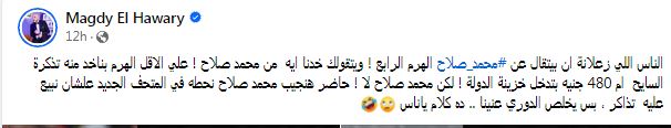 وكتب مجدي الهواري عبر صفحته الرسمية "فيس بوك" الناس اللي زعلانة ان بيتقال عن محمد صلاح الهرم الرابع ! و تقولك خدنا ايه من محمد صلاح ! علي الاقل الهرم بناخد منه تذكرة السايح ام 480 جنيه تدخل خزينة الدولة ! لكن محمد صلاح لا ! حاضر هنجيب محمد صلاح نحطه في المتحف الجديد علشان نبيع عليه تذاكر ، بس يخلص الدوري عنينا .. ده كلام ياناس ".
