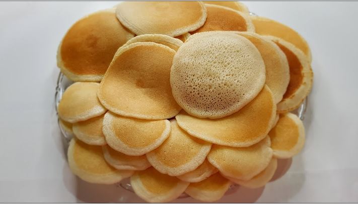 اغمس ملعقة كبيرة في الماء، ثم اسكب كمية مناسبة من العجينة على المقلاة بشكل دائري وقد تحتاج إلى استخدام معلقة لتوسيع العجينة إلى شكل دائري رقيق.