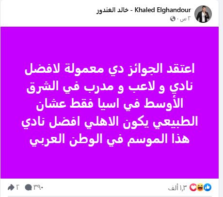 وقال “الغندور”: “اعتقد الجوائز دي معمولة لافضل نادي ولاعب ومدرب في الشرق الأوسط في اسيا فقط عشان الطبيعي يكون الاهلي افضل نادي هذا الموسم في الوطن العربي”.