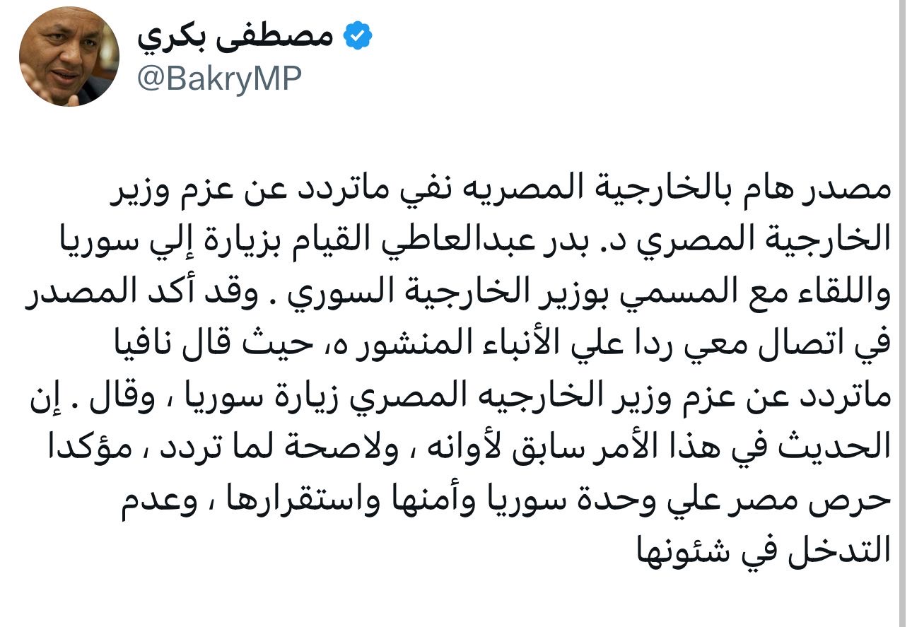 وقال مصطفي بكري على حسابه على موقع التواصل الاجتماعي " X" ،" مصدر هام بالخارجية المصريه نفي ماتردد عن عزم وزير الخارجية المصري د. بدر عبدالعاطي القيام بزيارة إلي سوريا واللقاء مع المسمي بوزير الخارجية السوري . وقد أكد المصدر في اتصال معي ردا علي الأنباء المنشور ه، حيث قال نافيا ماتردد عن عزم وزير الخارجيه المصري زيارة سوريا ، وقال . إن الحديث في هذا الأمر سابق لأوانه ، ولاصحة لما تردد ، مؤكدا حرص مصر علي وحدة سوريا وأمنها واستقرارها ، وعدم التدخل في شئونها".