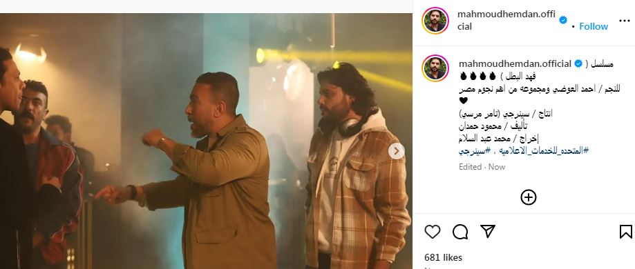 ونشر حمدان الصور عبر صفحته الرسمية "إنستجرام" وعلق عليها "مسلسل فهد البطل ،للنجم احمد العوضي ومجموعه من اهم نجوم مصر ".
