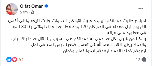 "امبارح طلبت دعواتكم، والنهارده حبيت أقولكم إن الدعوات جابت نتيجة. ثاني أكسيد الكربون في الدم انخفض من 120، وهو معدل خطير جدًا، إلى 80. لسه في خطورة على حياته، لكن فيه أمل."