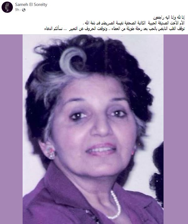 نعي الفنان سامح الصريطي شقيقته الكاتبة الصحفية نفيسة الصريطى والتي رحلت عن عالمنا صباح اليوم الأحد .