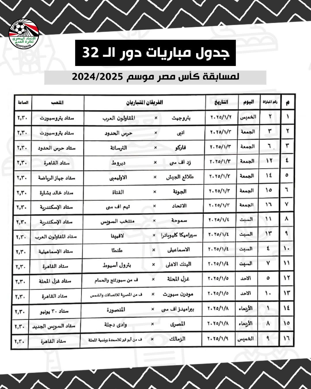 وتقام مباريات دور الـ32 من البطولة العريقة في الفترة من الخميس 2 يناير 2025 وحتى الاثنين 8 يناير 2025.