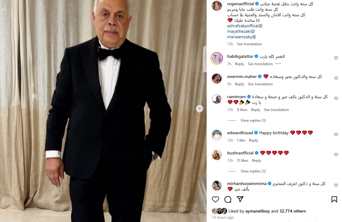 على جانب أخر نشر عدد من نجوم الفن صوراً تجمعهم بالفنان أشرف زكي عبر خاصية ستوري في حساباتهم الرسمية على موقعي "فيسبوك"، و"إنستجرام" متمنيين له حياة سعيدة هو وزوجته النجمة روجينا، وأن يطيل الله في عمره ويجعله سنداً لكل أعضاء النقابة من الفنانيين.
