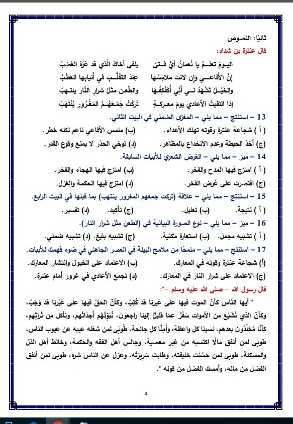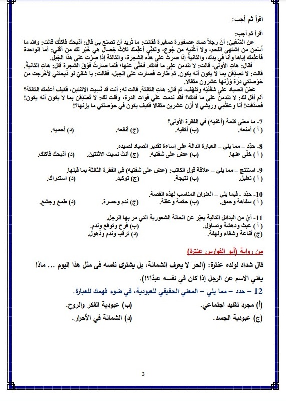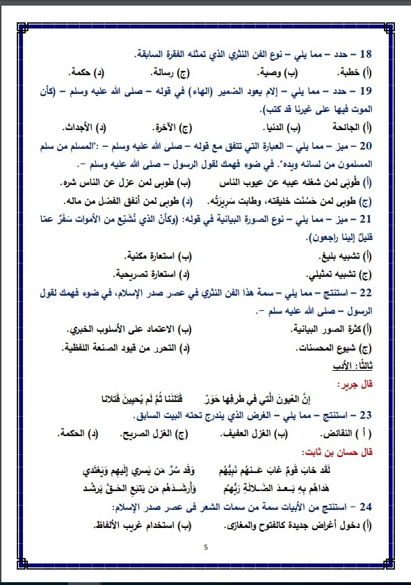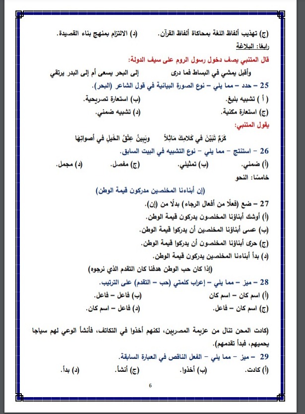 نماذج امتحان مادة اللغة العربية للصف الأول الثانوي 2025