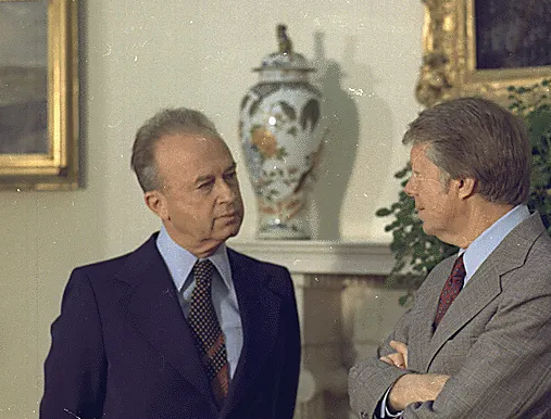 وفي عام 1977، دعا كارتر رئيس الوزراء آنذاك إسحاق رابين إلى البيت الأبيض. وناقش الاثنان القضية الإسرائيلية الفلسطينية، وادعى كارتر أن المستوطنات تشكل "عقبة أمام السلام". وبعد ذلك، وصل الحسين ملك الأردن، والرئيس الراحل أنور السادات إلى البيت الأبيض. ونجح كارتر في إقناع السادات بزيارة إسرائيل. ومع الاضطرابات التي شهدتها إسرائيل عام 1977، عندما وصل مناحيم بيغن إلى السلطة، جاء أيضاً إلى واشنطن.