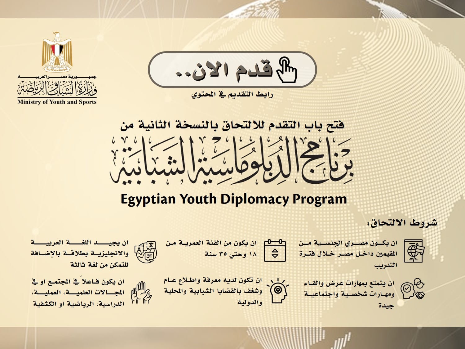 أعلنت وزارة الشباب والرياضة عن وصول عدد المتقدمين في أولى أيام فتح باب التقدم للالتحاق بالنسخة الثالثة من برنامج الدبلوماسية الشبابية إلى قرابة ١٥٠٠ متقدم، والذي تنفذه الوزارة من خلال الإدارة المركزية للتعليم المدني ووحدة الدبلوماسية الشبابية.