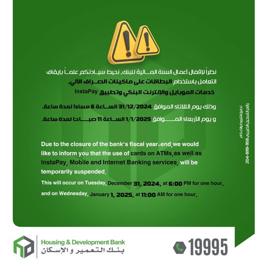 أعلن بنك التعمير والإسكان أنه حرصاً على إتمام الإجراءات الخاصة بإقفال السنة المالية للبنك، نود إعلام سيادتكم بأنه سيتم إيقاف التعامل باستخدام البطاقات على ماكينات الصراف الآلي، بالإضافة إلىInstapay خدمات الموبايل والإنترنت البنكي وتطبيق انستا باي