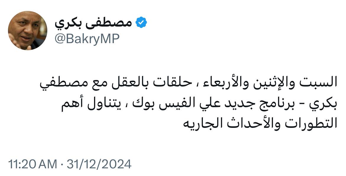 أعلن الإعلامي مصطفى بكري عن اسم برنامج جديد يقدمه عبر منصات التواصل الاجتماعي، ويحمل البرنامج اسم "بالعقل مع مصطفى بكري".