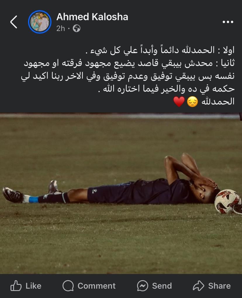 ونشر كالوشا عبر صفحته الرسمية على فيسبوك "صفحته على موقع التواصل الاجتماعي "فيسبوك" :" أولا : الحمدلله دائماً وأبداً علي كل شيء ،ثانيا : محدش بيبقي قاصد يضيع مجهود فرقته او مجهود نفسه بس بيبقي توفيق وعدم توفيق وفي الاخر ربنا اكيد لي حكمه في ده والخير فيما اختاره الله ،الحمدلله ".