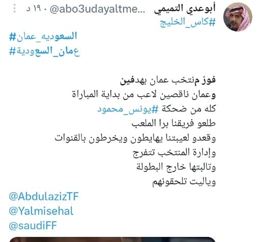 وذكر حساب آخر باسم أبو علي المحروقي، تعليق على الهزيمة الساحقة التي تلقاها المنتخب السعودي من عمان، قائلًا: "وين بو يقول إذا فاز منتخب عمان بعطيكم تيس مندي"