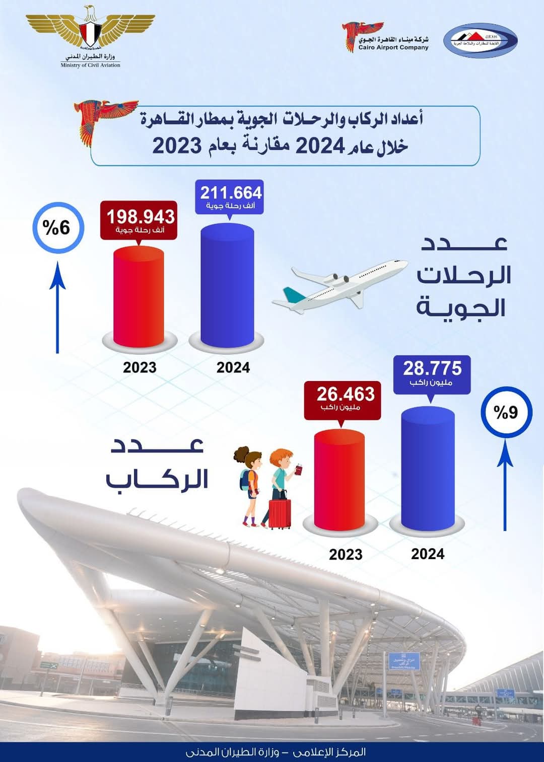 نشرت وزارة الطيران المدني إنفوجراف يوضح ارتفاع مؤشرات عدد الركاب والرحلات الجوية بمطار القاهرة الدولي لعام 2024 مقارنة بعام 2023.
