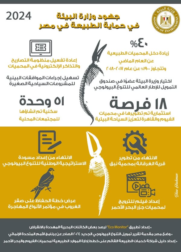 ولفتت وزيرة البيئة إلى أن عام 2024 شهد إعادة تفعيل منظومة التصاريح والتذاكر الإلكترونية في المحميات بالتعاون مع مشروع “شرم خضراء” كما تم إعداد تطبيق “Eco Monitor” بالتعاون مع غرفة الغوص والأنشطة البحرية بهدف رصد بعض الكائنات البحرية المهددة بالانقراض، ويتيح التطبيق الفرصة لقطاع الغوص وممارسي الأنشطة البحرية المشاركة في جهود رصد وصون التنوع البيولوجي البحري بالتعاون مع مشروع “شرم خضراء”. كذلك تم إعداد الدليل الإرشادي لتدريب فريق عمل المحميات الطبيعية على أحدث أساليب الإدارة وعقد دورة تدريبية بالتعاون مع مشروع دمج صون التنوع البيولوجي بالسياحة في مصر مع إعداد دراسة عن كيفية تطبيق مفهوم استعاضة التنوع البيولوجي في مصر. كما تم إزالة التعديات على أراضي بمحمية وادي الأسيوطي لإنفاذ القانون.