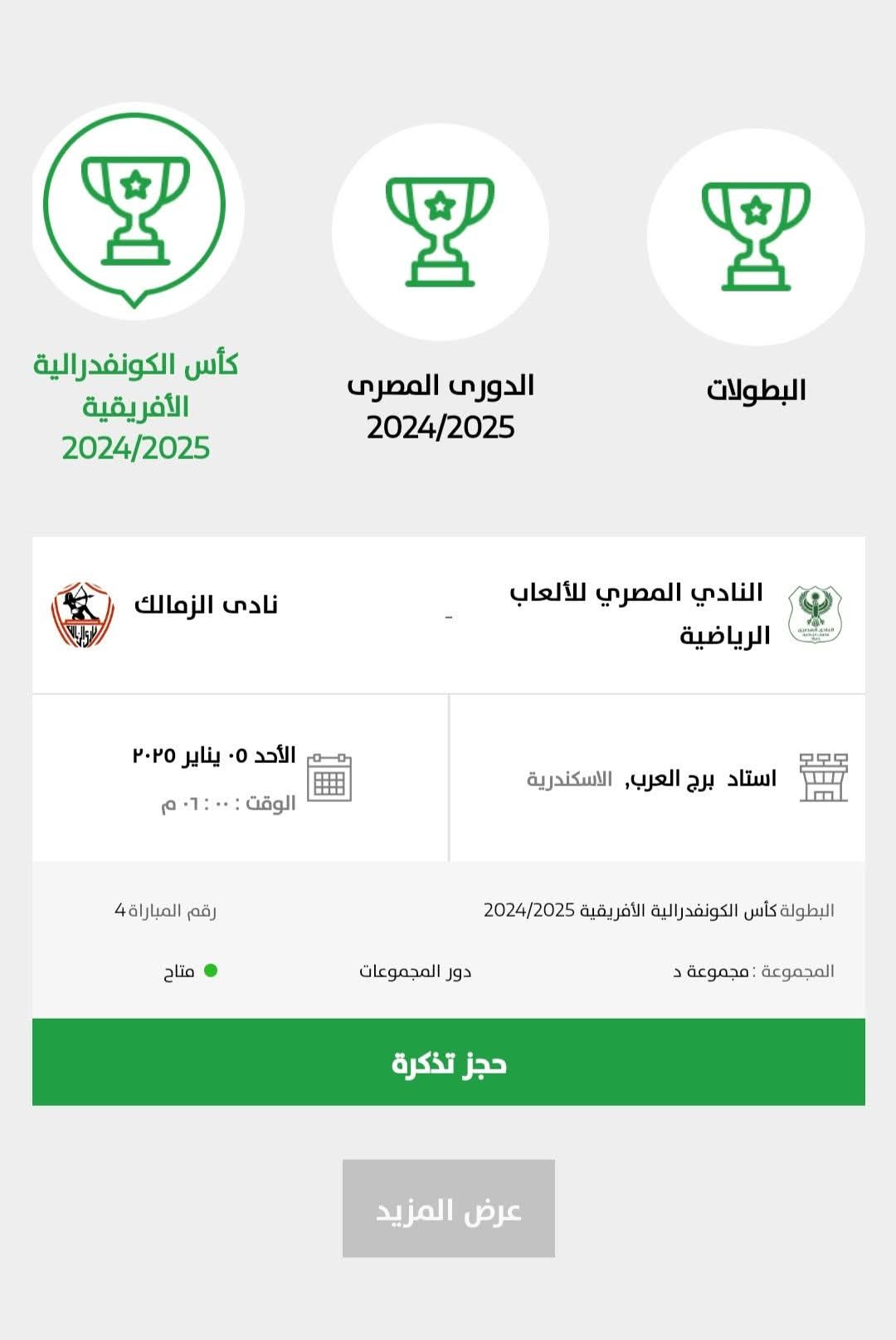طرح تذاكر مباراة المصري ضد الزمالك في الكونفدرالية الإفريقية 2025
