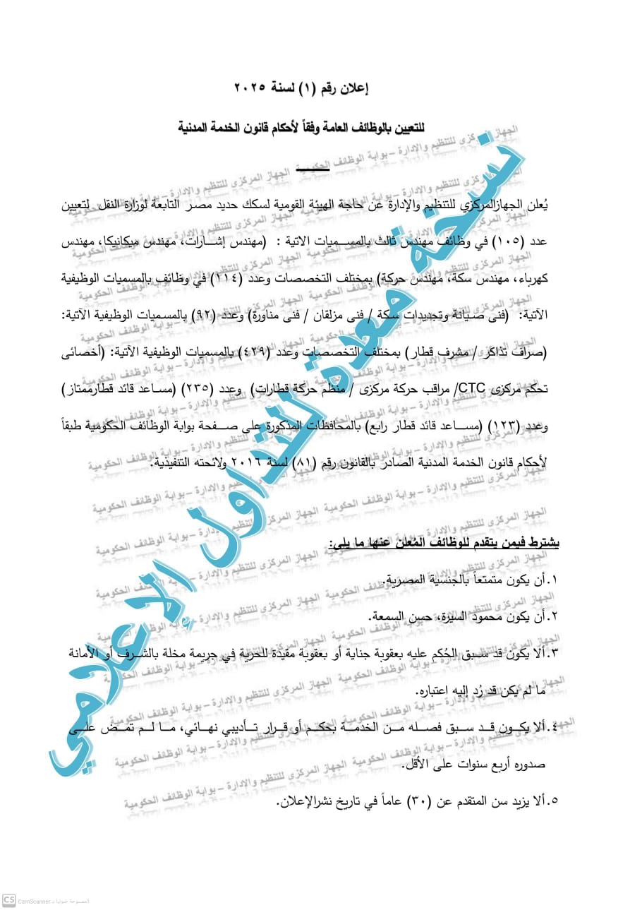 وتتضمن المسابقة الإعلان عن حاجة الهيئة لعدد (105) في وظائف مهندس ثالث بالمسميات الاتية (مهندس إشارات، مهندس ميكانيكا، مهندس كهرباء، مهندس سكة، مهندس حركة) بمختلف التخصصات، وعدد (114) في وظائف بالمسميات الوظيفية الآتية (فني صيانة وتجديدات سكة، فني مزلقان، فني مناورة)، وعدد (92) بالمسميات الوظيفية الآتية (صراف تذاكر، مشرف قطار) بمختلف التخصصات، وعدد (429) بالمسميات الوظيفية الآتية (أخصائي تحكم مركزي CTC، مراقب حركة مركزي، منظم حركة قطارات)، وعدد (235) (مساعد قائد قطار ممتاز)، وعدد (123) (مساعد قائد قطار رابع) بالمحافظات المذكورة على صفحة بوابة الوظائف الحكومية طبقاً لأحكام قانون الخدمة المدنية الصادر بالقانون رقم (81) لسنة 2016 ولائحته التنفيذية.