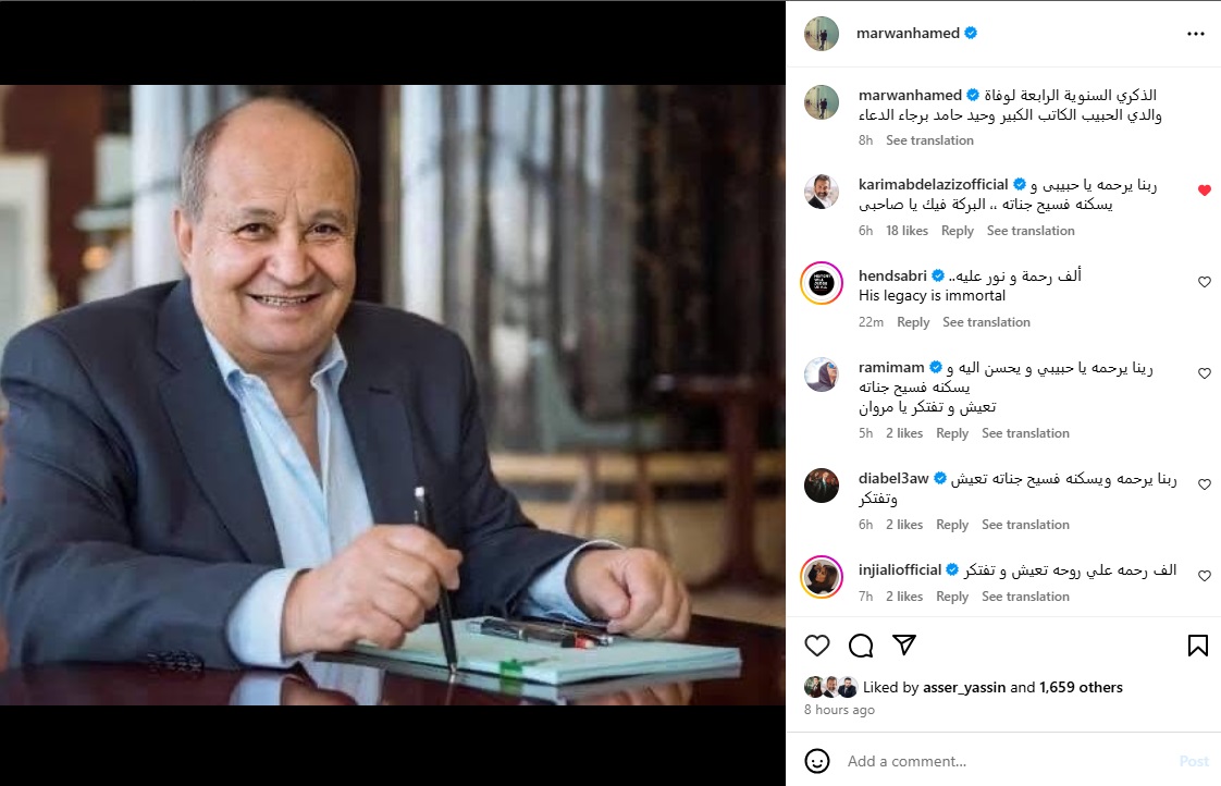 وكتب مروان حامد معلقاً على صورة والده،: "الذكري السنوية الرابعة لوفاة والدي الحبيب الكاتب الكبير وحيد حامد برجاء الدعاء".