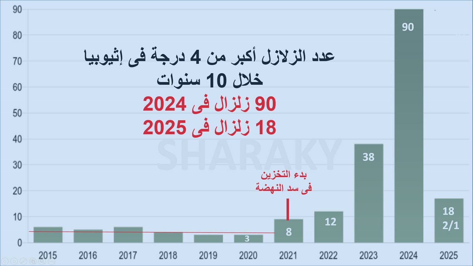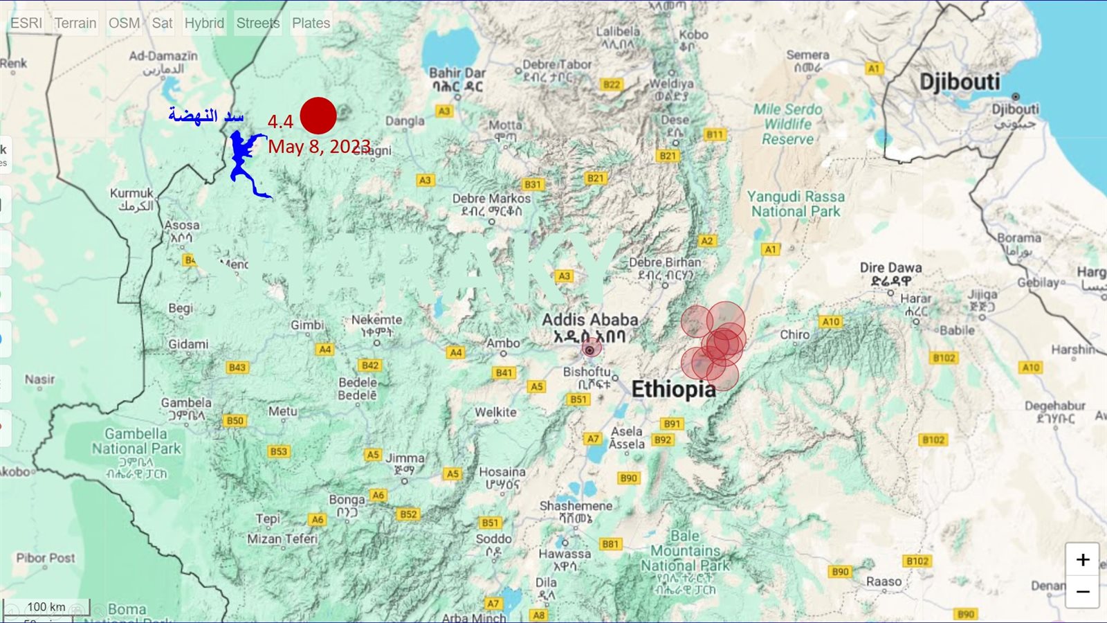 ويكمل: تبعد سلسلة الزلازل الأخيرة حوالى 500 - 600 كم عن سد النهضة، وهى لا تشكل خطورة فى الوقت الحالى، وحدث فى 8 مايو 2023 أقرب زلزال من سد النهضة بقوة 4.4 درجة على بعد 100 كم، وكان التخزين 15 مليار م3 فى ذلك الوقت.