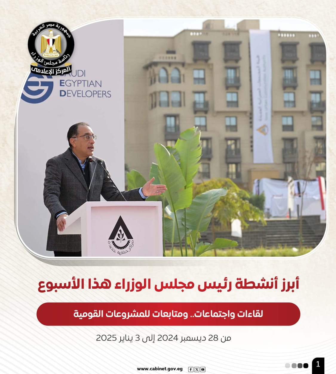 قام الدكتور مصطفى مدبولي، رئيس مجلس الوزراء، خلال الأسبوع الجاري من 28 ديسمبر2024 إلى3 يناير2025، بعدد من الأنشطة التي شملت تفقد سيادته مستجدات المشروع القومي لتطوير صناعة الغزل والنسيج بالمحلة الكبرى، نظرًا لما توليه الحكومة من اهتمام بالغ بتلك الصناعة، كونها إحدى الركائز الأساسية لدعم التنمية الاقتصادية، علاوة على متابعة سيادته آخر التطورات لعدد من المشروعات السكنية، والتي تمثل حجر الزاوية لتحسين جودة حياة المواطنين وتعزيز التنمية العمرانية، وكذلك عقد عدد من اللقاءات مع شركاء الصناعة الدوليين، نظرًا لأهمية هذه الشراكات في نقل التكنولوجيا، وتعزيز تنافسية المنتجات المصرية عالميًا، علاوة على اهتمام رئيس مجلس الوزراء خلال الأسبوع الجاري بتفقد مشروعات تطوير قلب القاهرة التاريخية، وذلك حرصًا على الحفاظ على الهوية الثقافية، والإرث الحضاري لمصر.