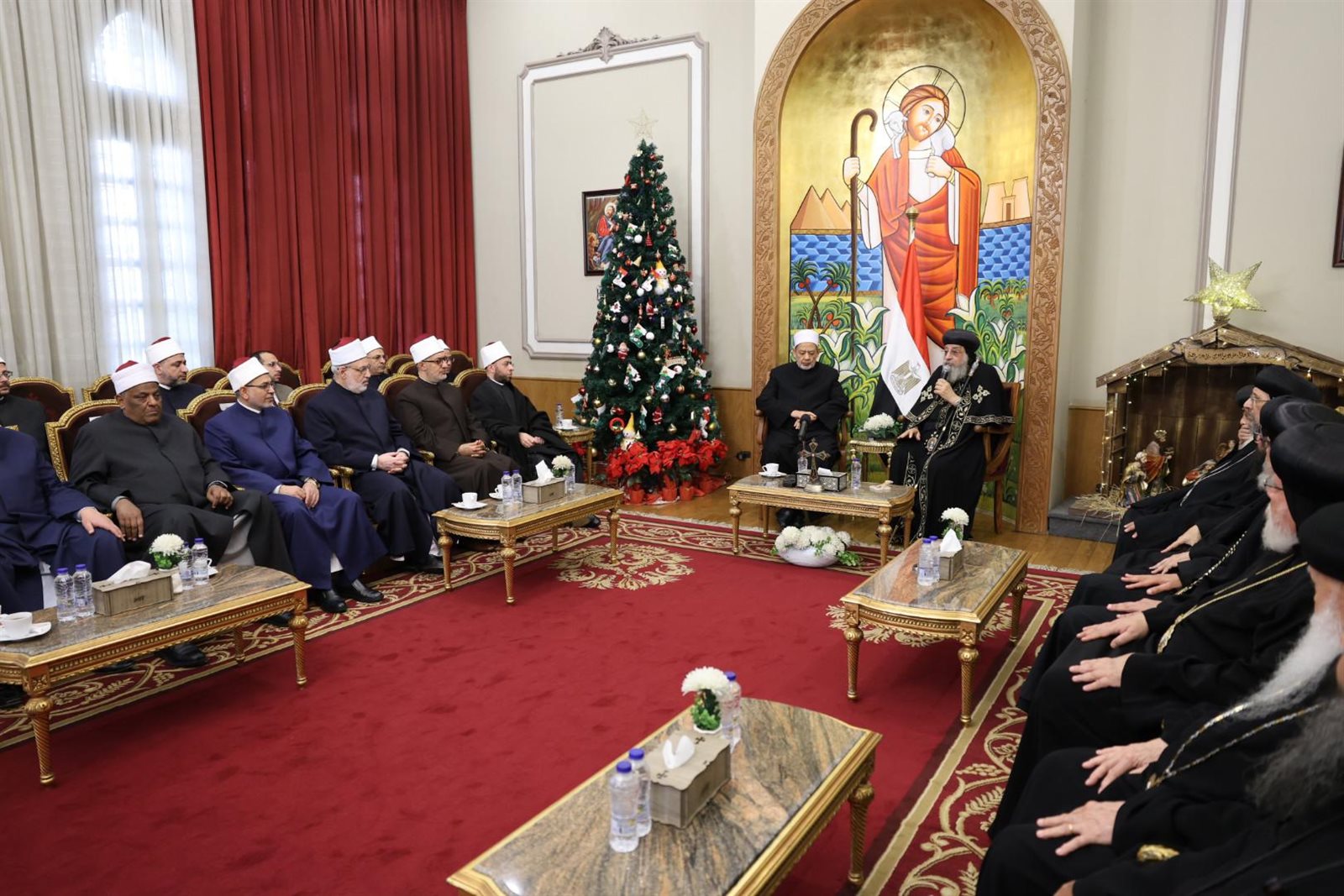 من جانبه، رحب قداسة البابا تواضروس بشيخ الأزهر والوفد المرافق له، مؤكدا أن هذه الزيارة تعكس الروح الأخوية التي تجمع المصريين؛ مسيحين ومسلمين، متمنيا أن تأتي الأعوام القادمة على العالم أجمع بالخير والسلام والاستقرار، مصرحا قداسته: "اشعر بمقدار الود والمحبة والمشاعر الطيبة التي تربطني بشيخ الأزهر، ونتبادل الأحاديث والنقاشات حول مختلف القضايا، وهو ما يكشف قدر الوحدة والأخوة الموجودة على أرض مصر، دعواتنا دائمة من أجل استمرار هذه اللحمة الوطنية القوية ونموها".