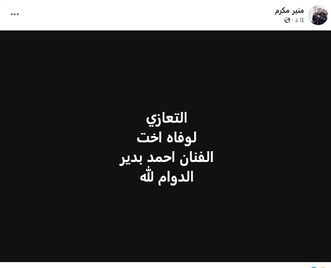 أعلن عضو مجلس نقابة المهن التمثيلية الفنان منير مكرم وفاة شقيقة النجم أحمد بدير وذلك عبر حسابه الرسمي على فيسبوك، وكتب منير مكرم في منشور له: خالص التعازي لوفاة أخت الفنان أحمد بدير، الدوام لله".