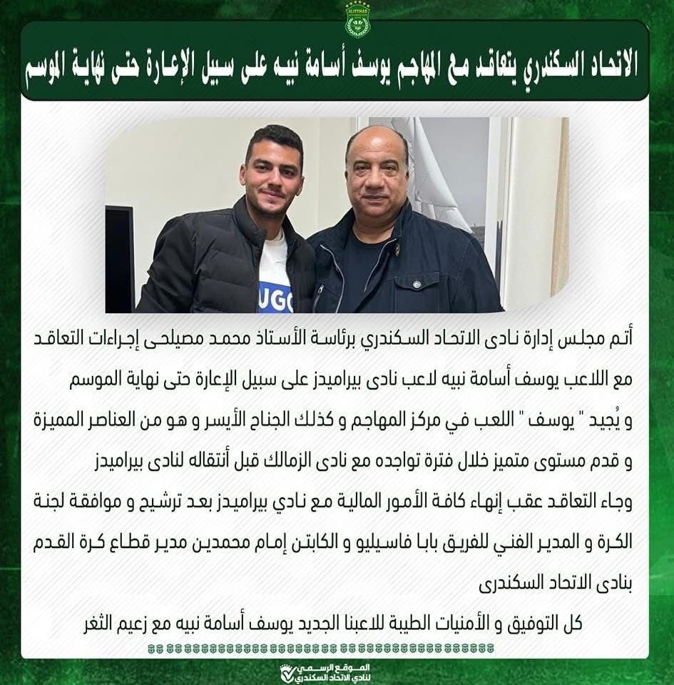وكتب الاتحاد في بيان عبر حسابه على «فيس بوك»: «أتم مجلس إدارة نادى الاتحاد السكندري برئاسة محمد مصيلحى إجراءات التعاقد مع اللاعب يوسف أسامة نبيه لاعب نادى بيراميدز على سبيل الإعارة حتى نهاية الموسم».
