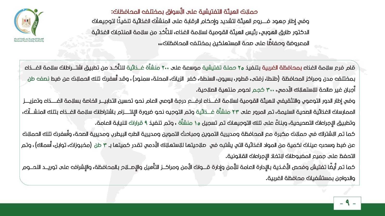 ونفذ مفتشو إدارة الشكاوى حملات على 461 منشأة غذائية للتأكد من سلامة المنتجات الغذائية المعروضة في محافظات الغربية، الدقهلية، الاسكندرية، بور سعيد، كفر الشيخ، سوهاج، أسوان، شمال سيناء، الجيزة، ومدينتي الشروق والعاشر من رمضان، مع اتخاذ كافة الإجراءات التصحيحية اللازمة في حالة وجود أية ملاحظات متعلقة باشتراطات سلامة الغذاء.