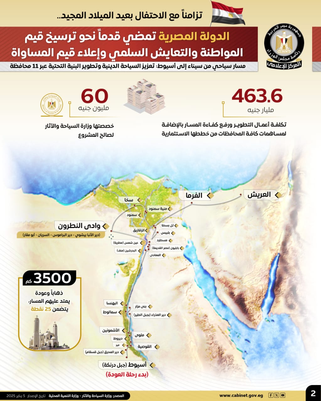 وأوضح التقرير أن المسار يمتد على طول 3500 كم ذهاباً وعودة، ويتضمن 25 نقطة، لافتاً إلى أن تكلفة أعمال التطوير ورفع كفاءة المسار بلغت 463.6 مليار جنيه، بالإضافة لمساهمات كافة المحافظات من خططها الاستثمارية، في حين خصصت وزارة السياحة والآثار 60 مليون جنيه لصالح المشروع.